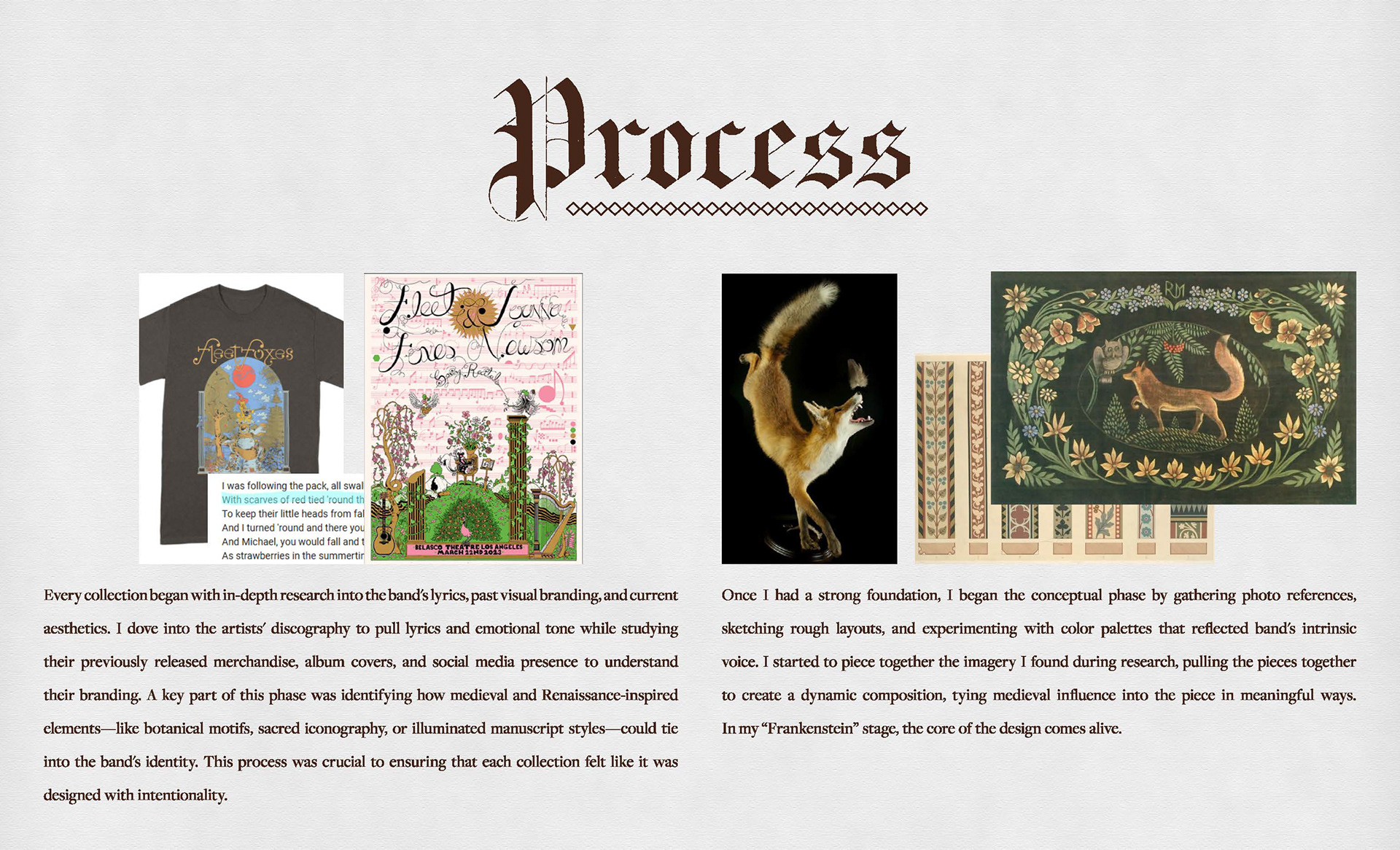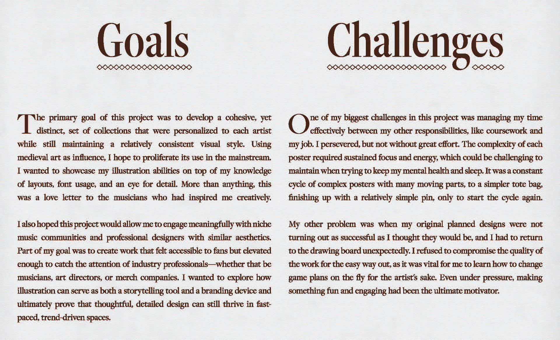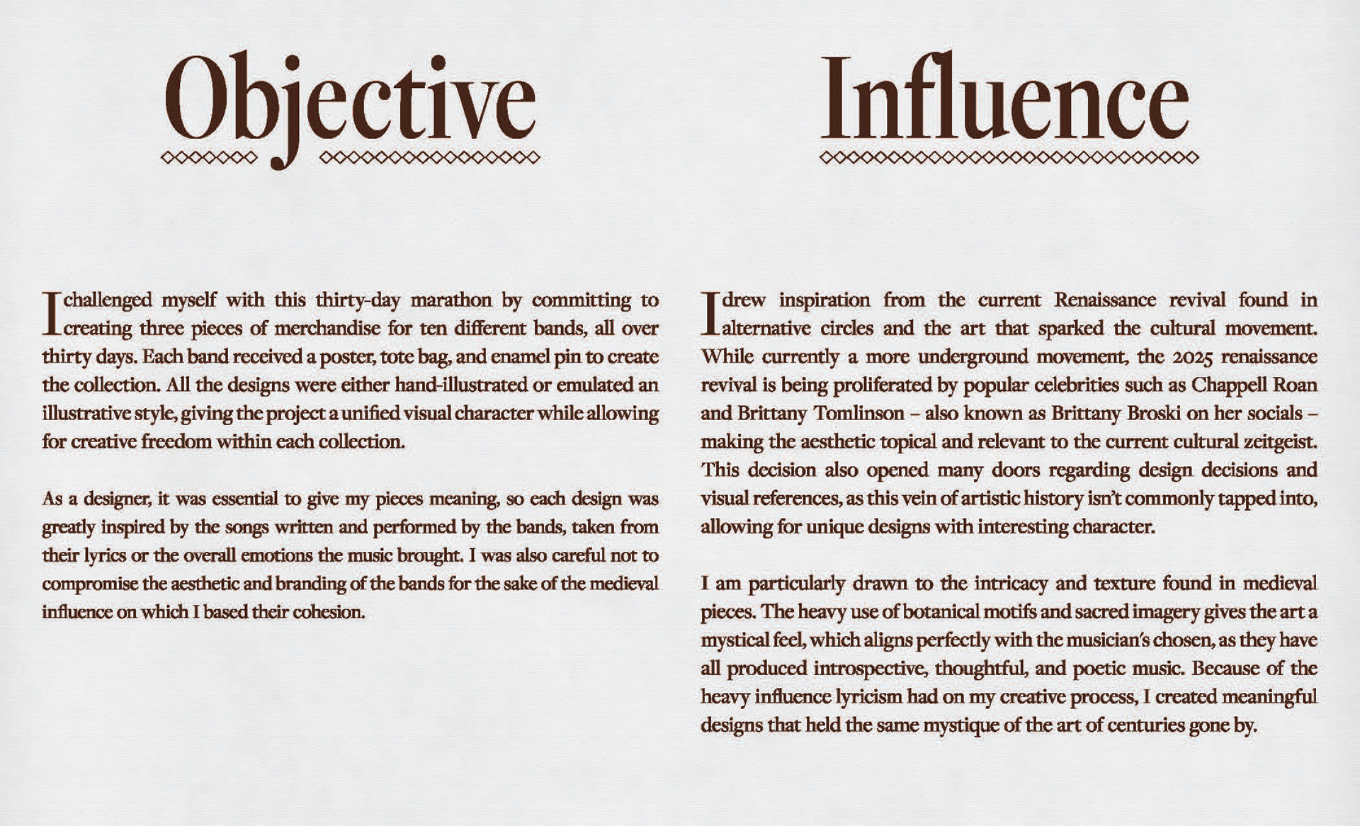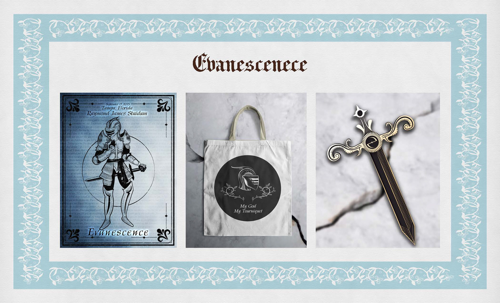 By blending the rich visuals of medieval art with the energy and personality of modern music, I created a series of collectible designs - posters, totes, and pins - for ten brands. Each piece is shaped by the growing interest in Renaissance-inspired aesthetics among younger audiences, while thoughtfully bridging the gap between old-world imagery and contemporary sound. The result is merchandise that feels both timeless and fresh, designed to emotionally connect with fans and stand out in today's market.